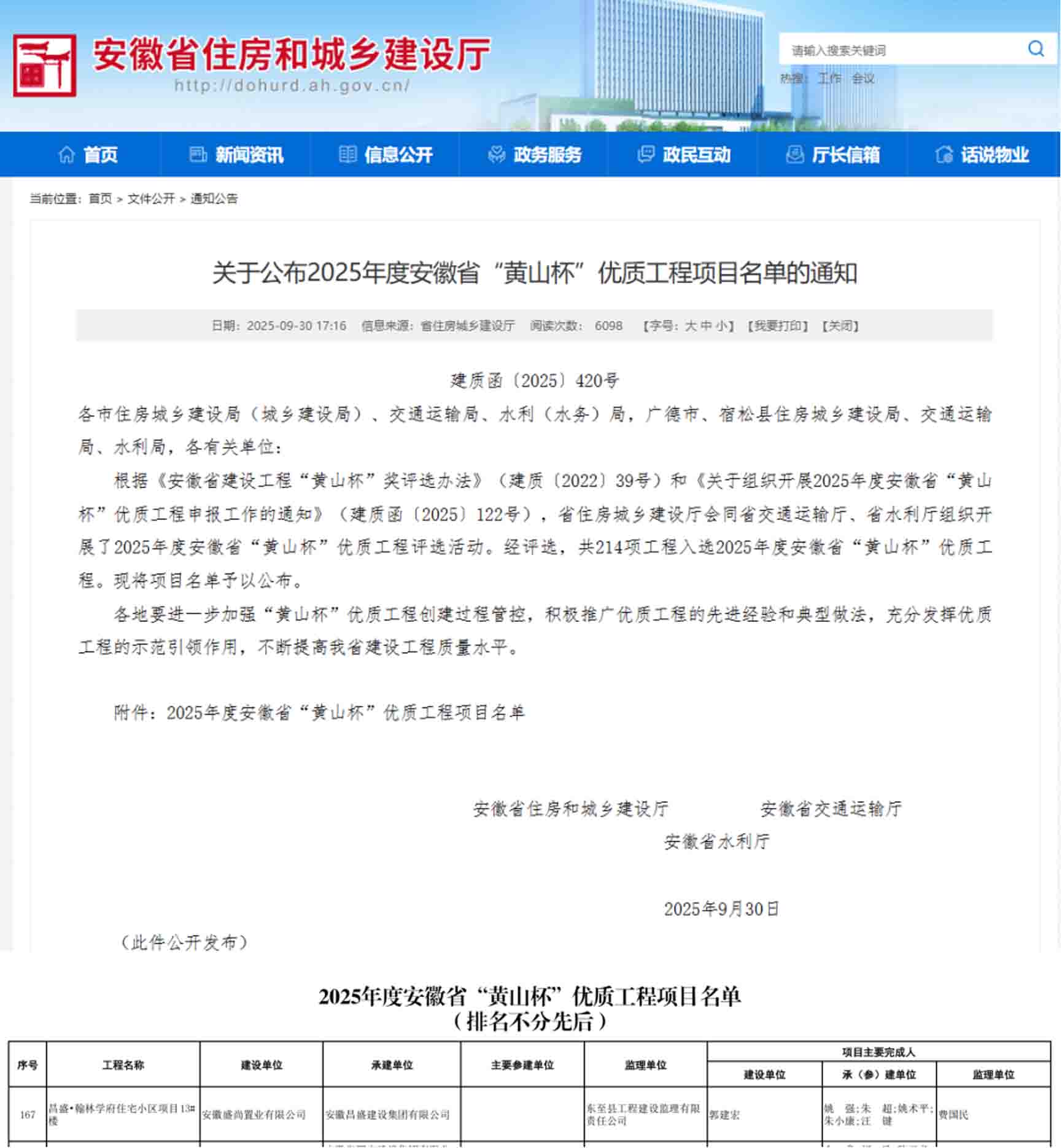 近日,安徽省住房和城乡建设厅公布2025年度建设工程“黄山杯”奖获奖名单,安徽昌盛建设集团有限公司承建的昌盛·翰林学府13#楼项目成功获奖。这已是公司五年内第四次荣获这一省级建设工程质量最高荣誉,展现了企业在工程质量领域的持续领先实力。